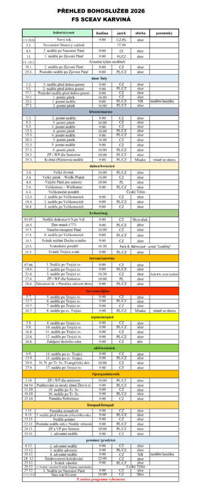 Jste srdečně zváni na pravidelné nedělní bohoslužby v 9:00 h (Masarykovo náměstí 4/3, Karviná) Streamy a záznamy z bohoslužeb zde Ke stažení zde: PŘEHLED BOHOSLUŽEB FS SCEAV KARVINÁ 2026